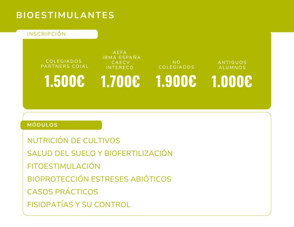 Los bioestimulantes ya ocupan un lugar estratégico en la agricultura actual. No hablamos solo de una tendencia de mercado, sino de un ámbito técnico cada vez más decisivo para mejorar la eficiencia de los cultivos, la respuesta frente a situaciones de estrés y la sostenibilidad de los sistemas productivos. Dentro de la 5ª ed. Programa Experto Profesional en Bioestimulantes y Biocontrol del COIAL, ofrecemos la posibilidad de matricularse por Áreas de conocimiento. Y una de las más relevantes es, precisamente, el Área de Bioestimulantes.