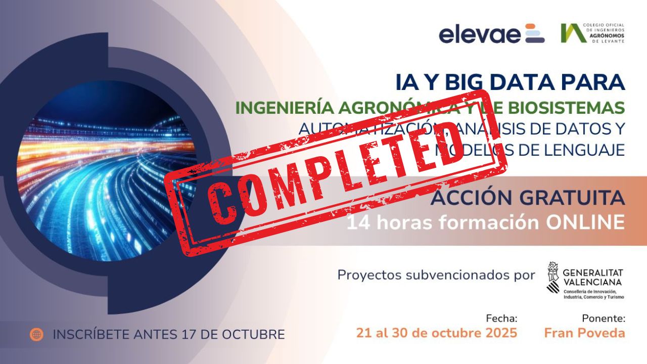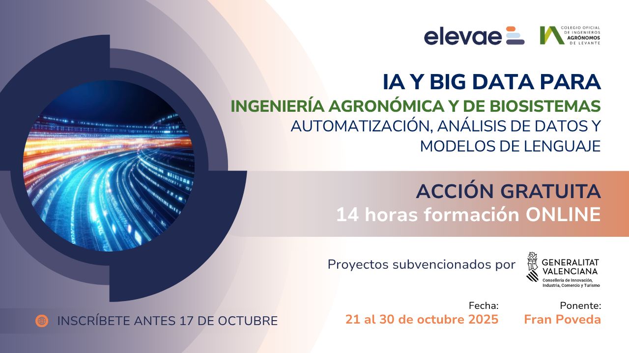 La Inteligencia Artificial ha dejado de ser una promesa de futuro para convertirse en una herramienta esencial del presente. Con el curso “IA y Big Data para ingenieria agronómica y de biosistemas: Automatización, análisis de datos y modelos de lenguaje”, los ingenieros agrónomos podrán dominar la IA sin necesidad de programar y mejorar la eficiencia en cada proceso, gracias a una formación 100% práctica y aplicada a entornos reales.