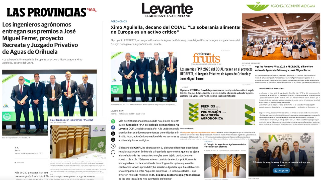 19/09/2025 – Agronews Comunitat Valenciana: El COIAL otorga los Premios FPIA 2025 a RECREATE, al histórico Juzgado Privativo de Aguas de Orihuela y a José Miguel Ferrer