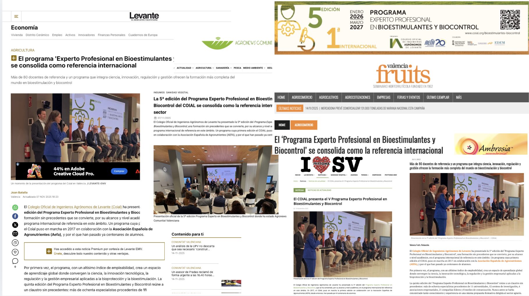 La 5ª edición del Programa Experto Profesional en Bioestimulantes y Biocontrol ha comenzado a aparecer en distintos medios de la Comunitat Valenciana, en una primera fase de difusión centrada en reforzar su presencia territorial y sectorial. Esta tanda inicial demuestra el interés que genera el programa entre la prensa especializada y económica, especialmente por su enfoque técnico, su dimensión profesional y la conexión con las empresas del sector.